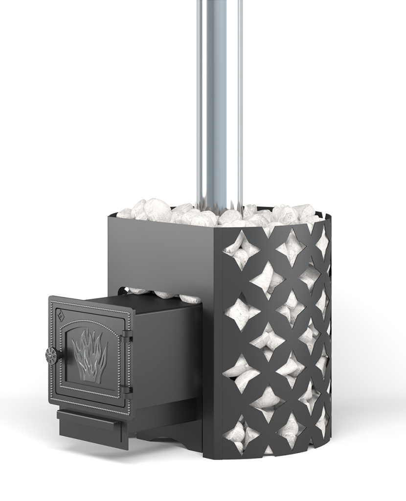 Для устройства наружной открытой каменки печь ЭТНА оснащается металлическим кожухом с прорезным рисунком оригинального дизайна. Пространство между печью и кожухом из двухмиллиметровой стали заполняется камнями для бани, которые выполняют роль теплонакопителя, перераспределяют тепло от стенок топки и защищают парящихся от жёсткого инфракрасного излучения. Воду подают на нагретые камни, с которых полученный пар распространяется по всему объёму парной.