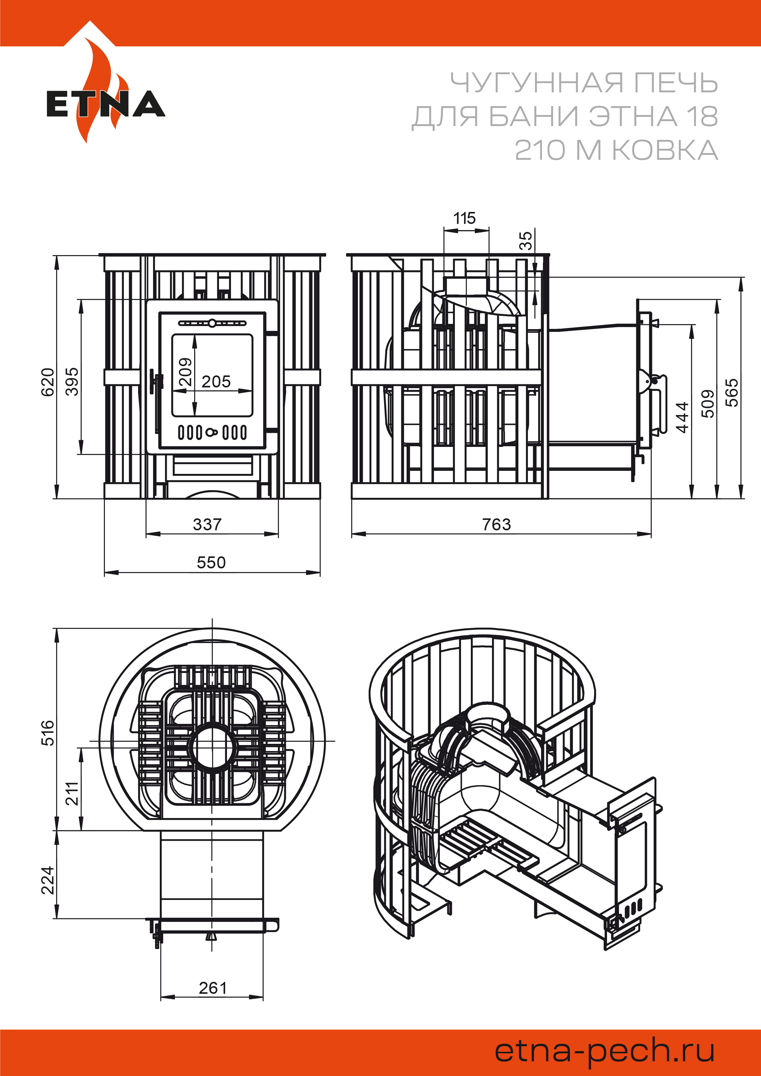 Банная печь ЭТНА 18 (210) М изготовлена из качественного чугуна. Чугун быстро передаёт энергию сжигаемого топлива наружу, в пространство парилки. Толщина деталей корпуса составляет 6-8 миллиметров.