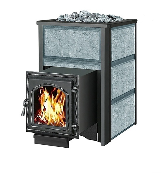 Конвекционно–вентилируемая облицовка, изготовленная из экологически чистой горной породы , который обладает большой теплоёмкостью, что позволяет камню в короткие сроки нагреваться и максимально долго удерживать стабильную температуру в парильном помещении, а также гасить жёсткое инфракрасное излучение Камень обладает исключительными лечебными свойствами: помогает при головных болях, при нестабильном артериальном давлении, при простудных заболеваниях, воспалительных процессах в почках и пищеварительной системе, снимает повышенную возбудимость и нервозность, сглаживает эмоциональные всплески. Облицовка из натурального камня при нагреве способна аккумулировать тепло, что гарантирует максимально равномерный прогрев и сохранение тепла Банная печь ЛЕГЕНДА 22 (270) укомплектован чугунной каминной, самоохлаждаемой дверцей Везувий 270 с большим жаропрочным стеклом «SHOT ROBAX», с оборудованной системой самоочистки, что позволяет визуально контролировать горение и любоваться видом живого огня. Данная печь рассчитана на объем парильного помещения 12-24 м3.