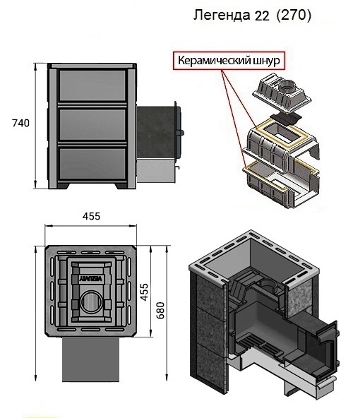 Преимущество печи в том, что топка печи состоит из 3-х ЧУГУННЫХ элементов. На стыке между ними используется керамический шнур с рабочей температурой 1200 градусов. То есть топка печи абсолютно герметична! Для фиксации деталей между собой применяется болтовое соединение, что даёт 100% гарантию безопасности при эксплуатации.