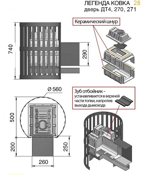 Банная чугунная печь Легенда ковка 28 (270) укомплектована чугунной герметичной дверцей Везувий 270  с жаропрочным стеклом «SHOT ROBAX», и  конвекционно-вентилируемый кожухом "КОВКА". В конструкции данной печи предусмотрен топочный тоннель длиной 250 мм, при помощи которого печь топится из соседнего помещения, смежного с парильнымм.