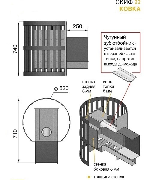 Технические характеристики объём парной 8-22 куб.м вес 90 кг высота 770 мм ширина 640 мм глубина 830 мм диаметр дымохода 115 мм масса закладываемых камней 180 кг размер загрузочного отверстия 325х290 мм Страна-изготовитель Россия