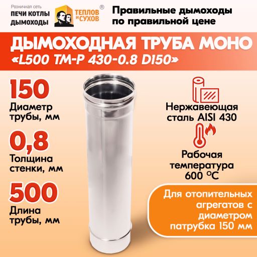 Трубы для дымохода из нержавейки L500 ТМ-Р 430-0.8 D150 для бани, газовый дымоход для котла и печная труба для отопительной печи