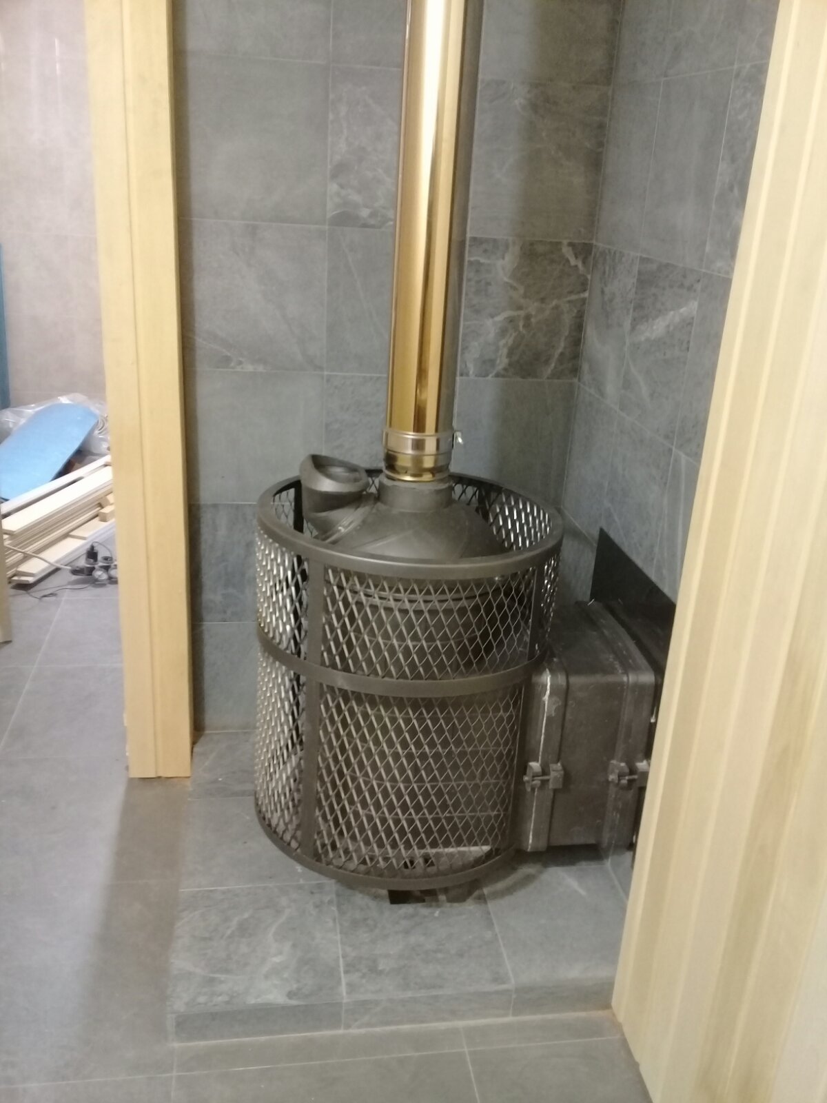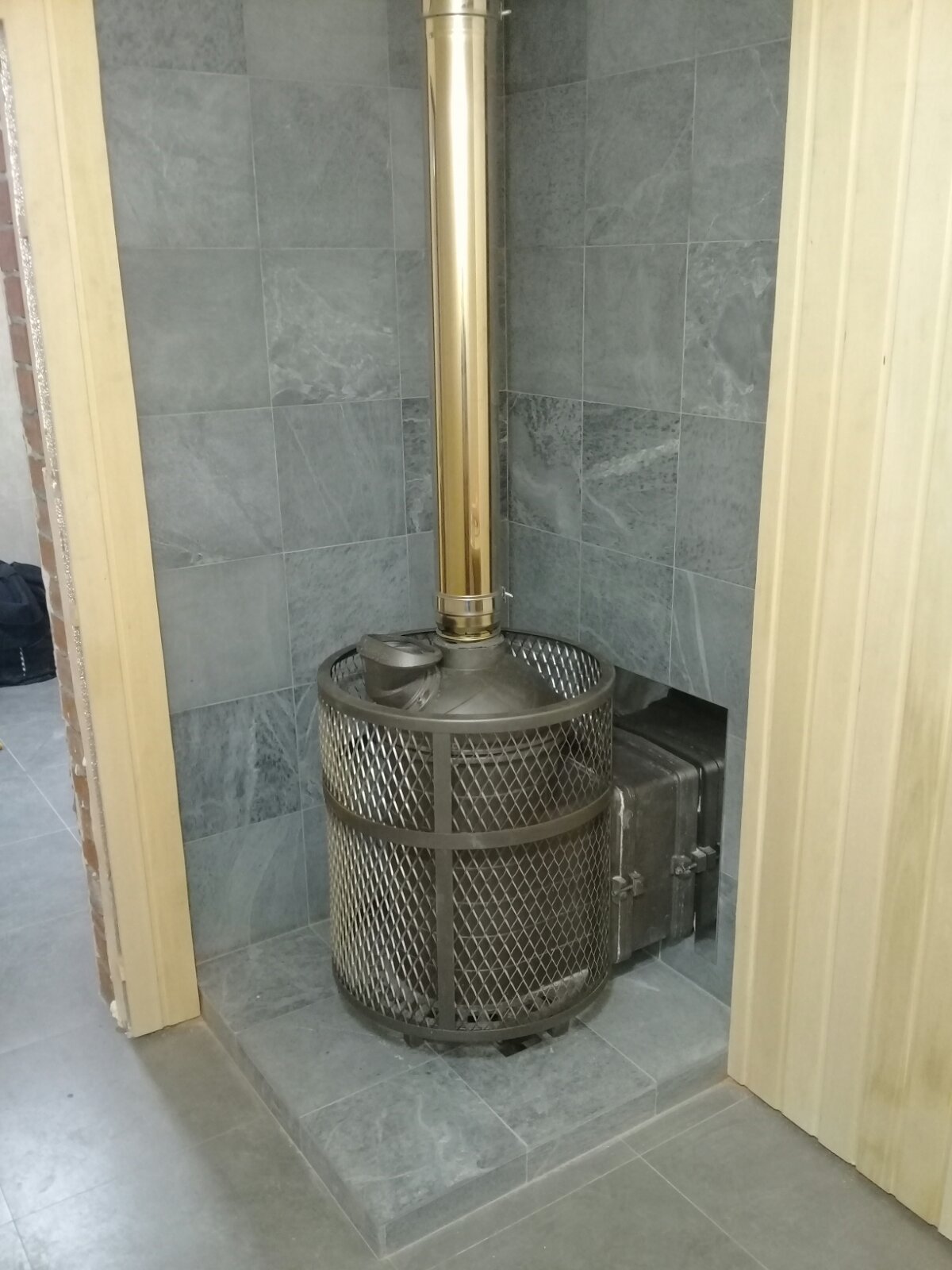 Монтаж печи Атмосфера с установкой дымохода и портала их натуральной каменной плитки со стороны комнаты отдыха